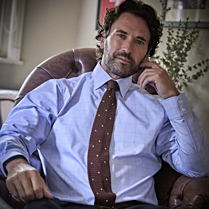 Contemporary Fit Grey & Blue Twill Check Cotton Shirt with Cut-away Collar & Two Button Cuff