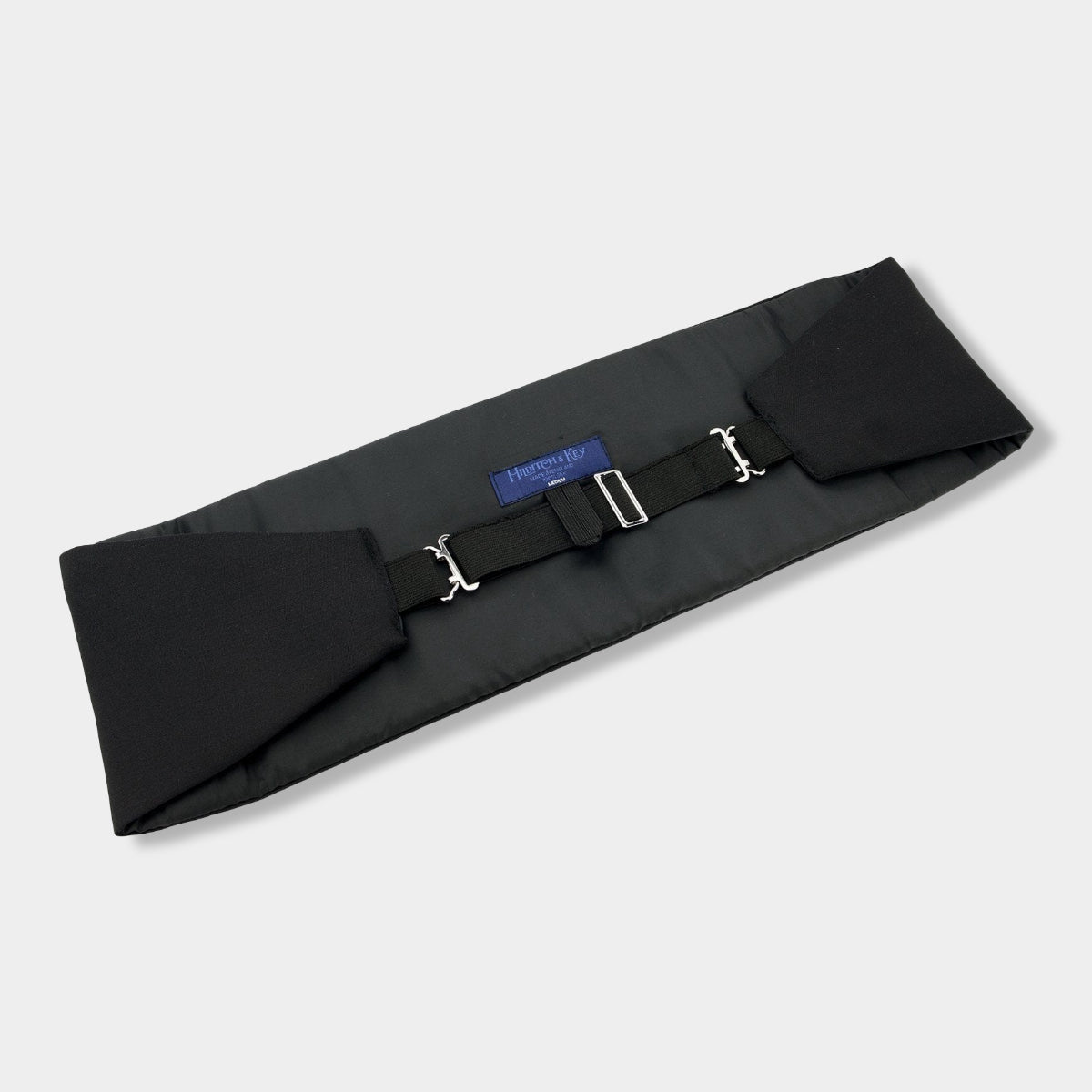 This classic cummerbund is made from pure silk in a barathea weave. Our cummerbunds have an elasticated back which allows for sizing adjustment, with a hook clasp securing them in place when being worn.