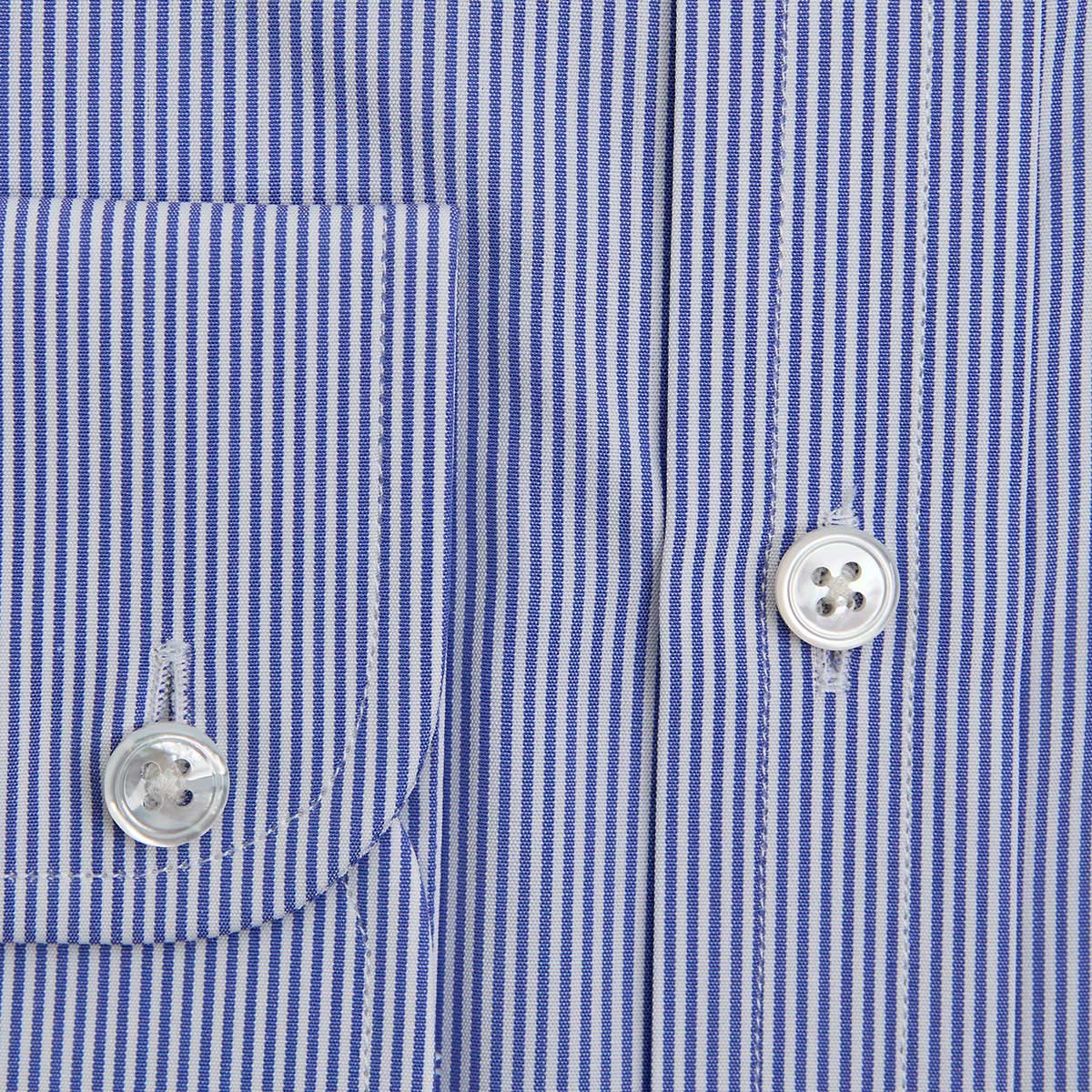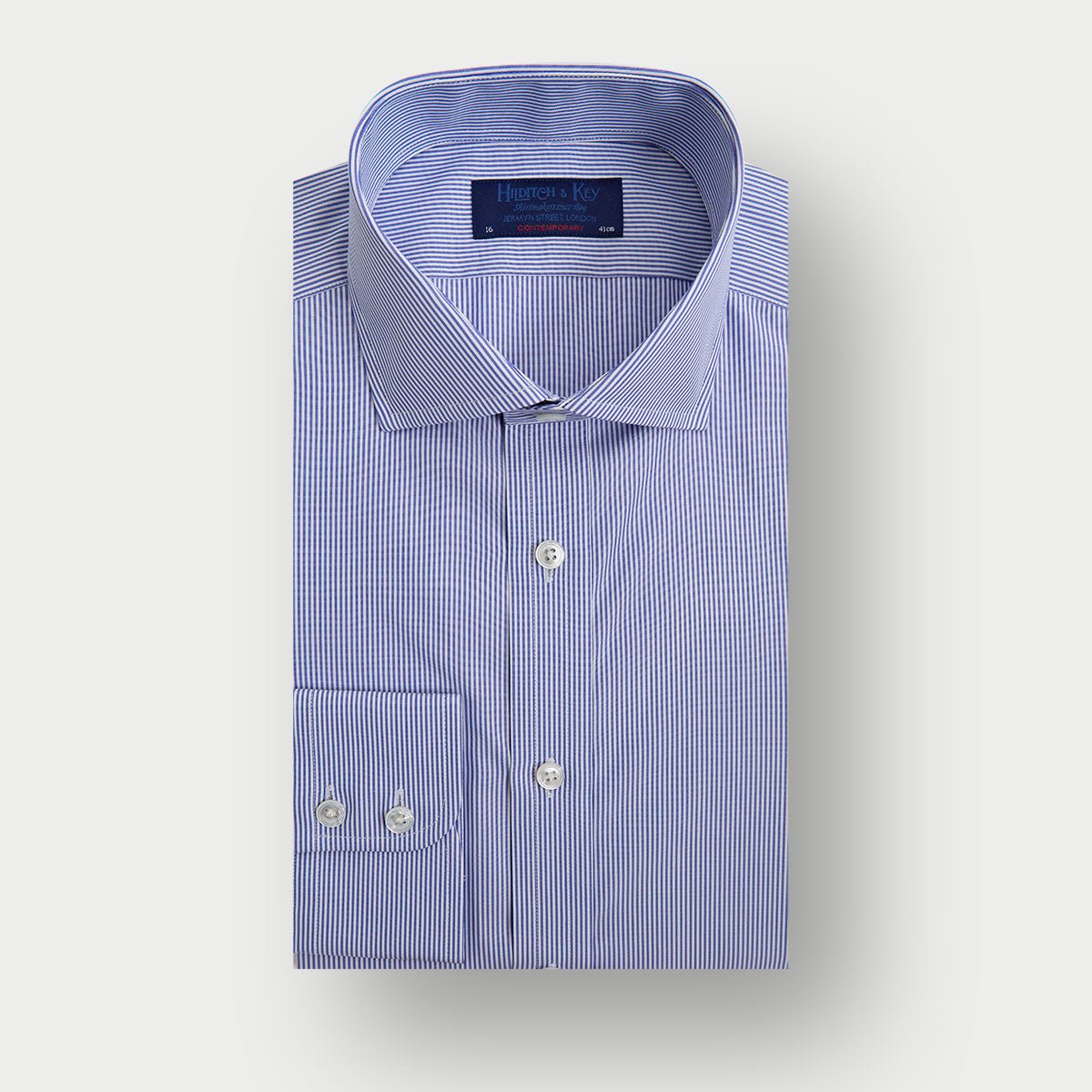 This Contemporary Fit Blue Fine Bengal Stripe Shirt features a crisp cotton poplin fabric with a stylish cut-away collar and two-button cuffs. The pattern is carefully matched for a polished look, and mother of pearl buttons add a refined touch. Perfect for elevating your everyday wardrobe with a clean, modern design.