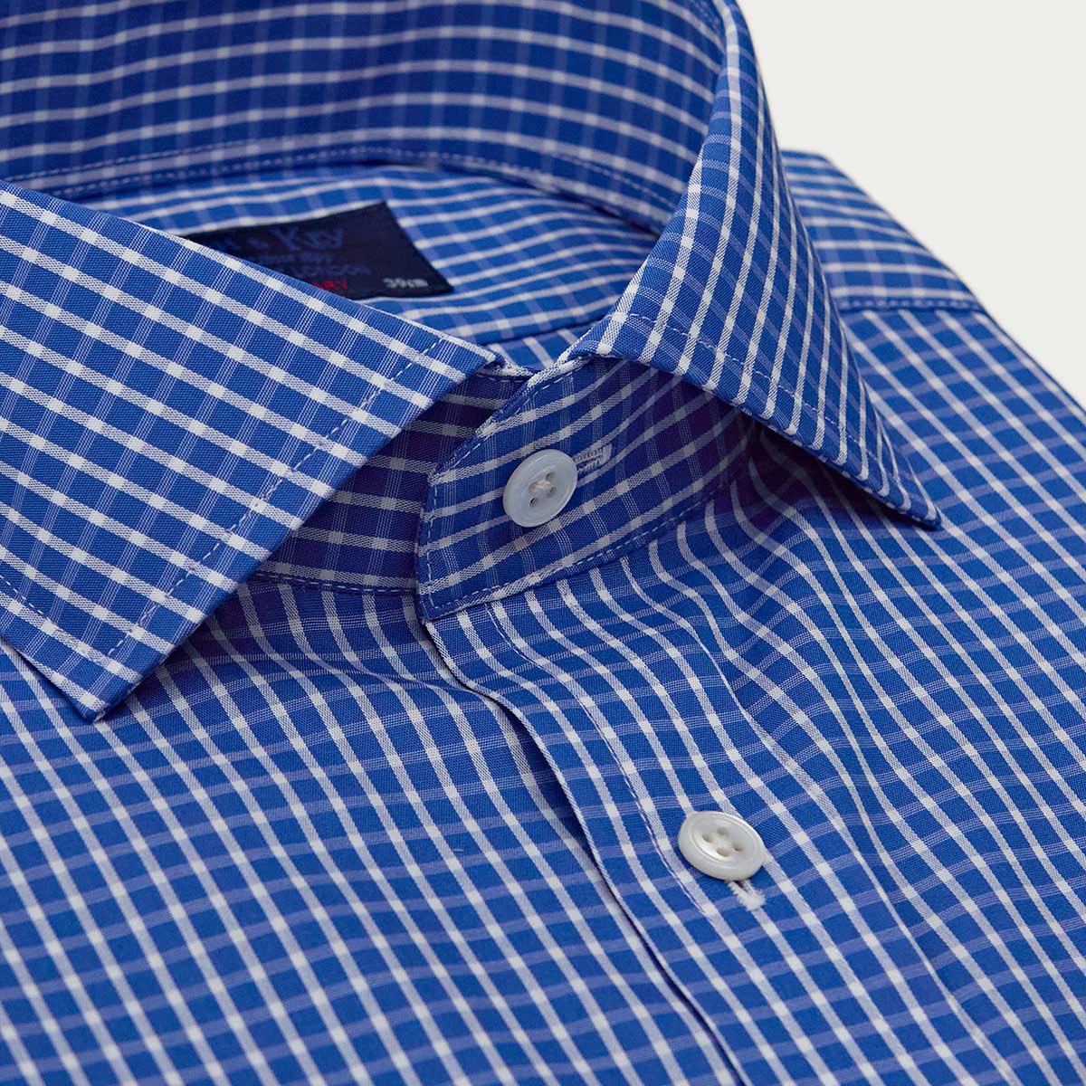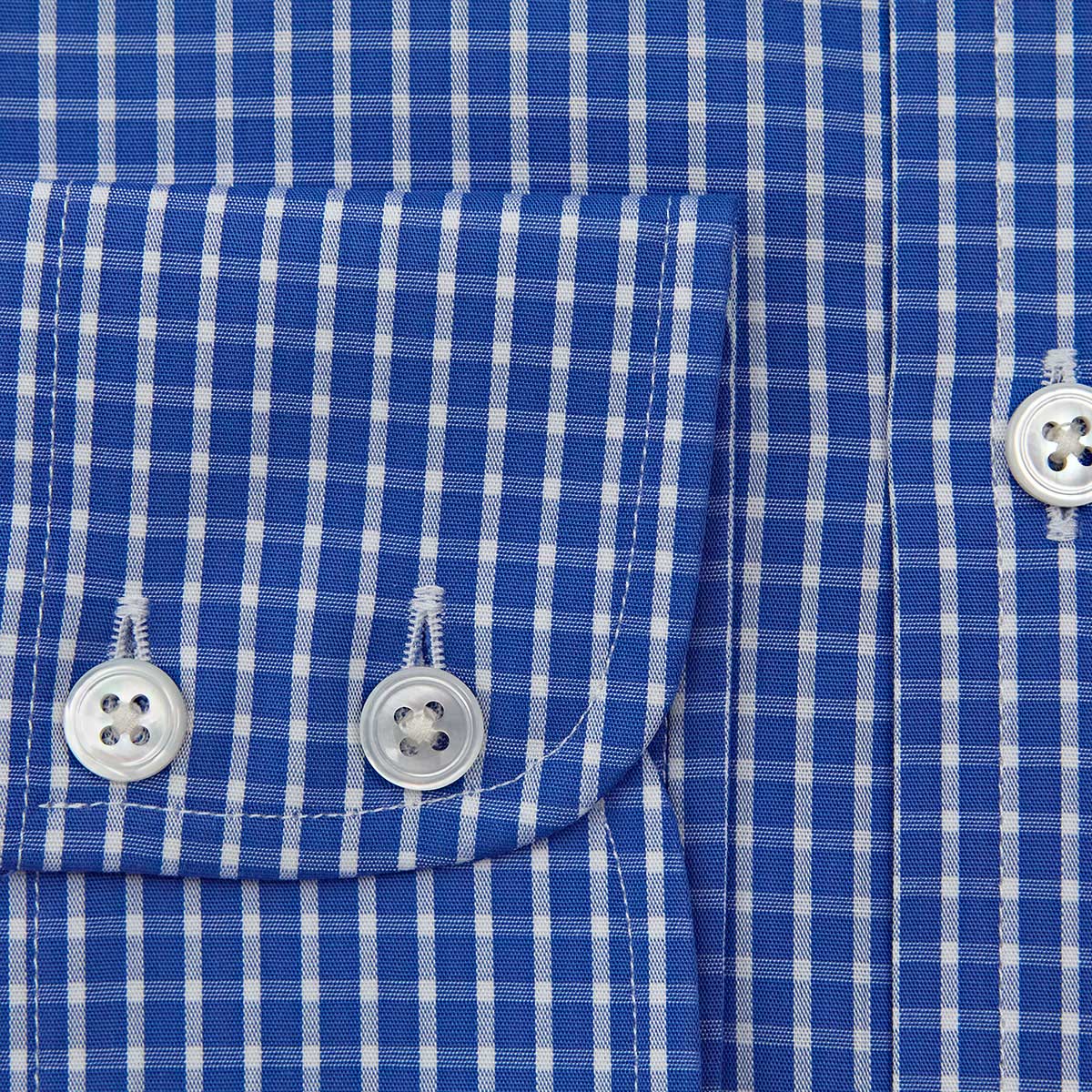 Elevate your wardrobe with this contemporary fit shirt, expertly tailored from premium cotton poplin. The sophisticated dark blue check pattern offers versatile styling for both professional and smart-casual occasions. A cut-away collar frames the face with modern elegance, whilst two-button cuffs provide refined functionality. Mother of pearl buttons add a luxurious finishing touch to this meticulously crafted piece, ensuring durability and timeless appeal.