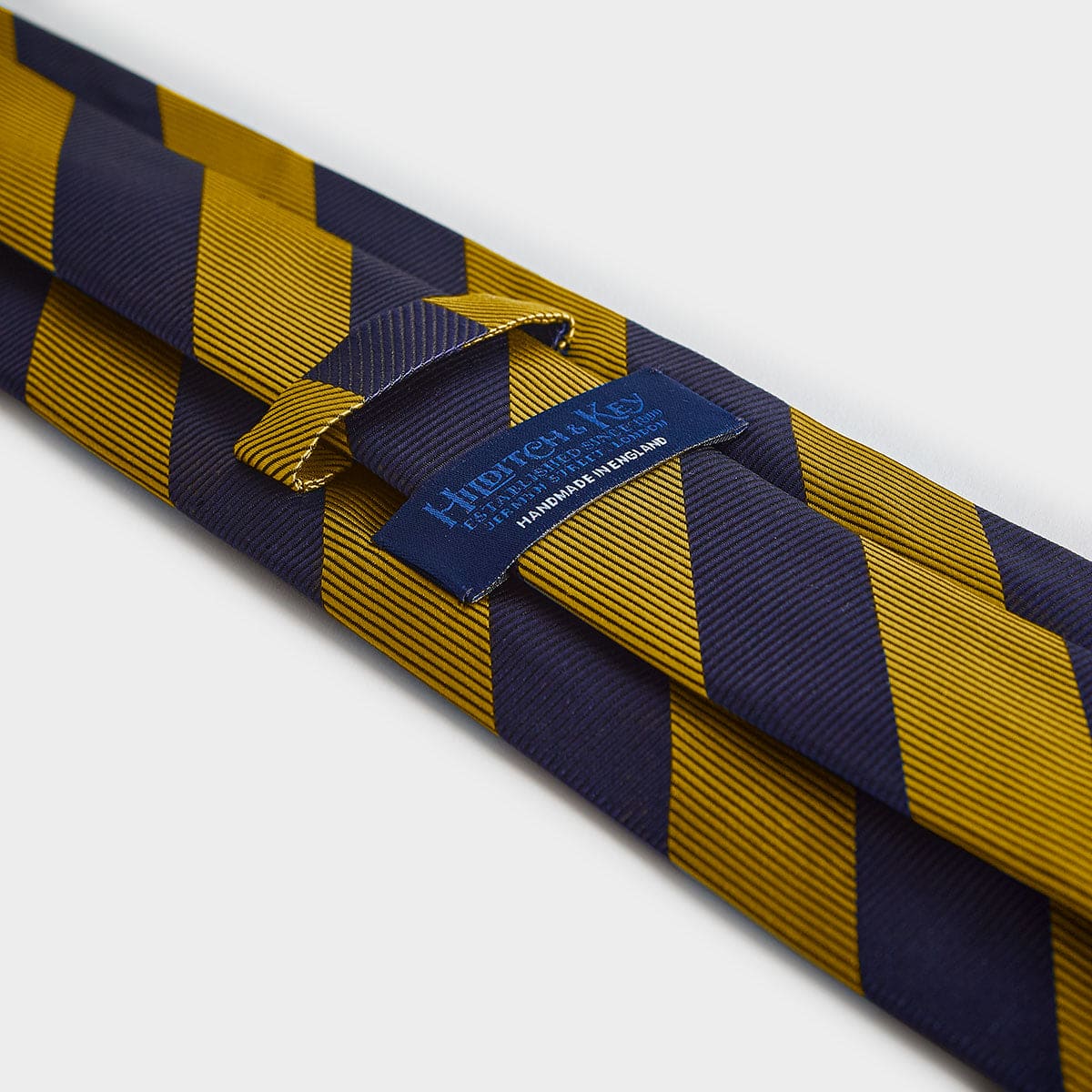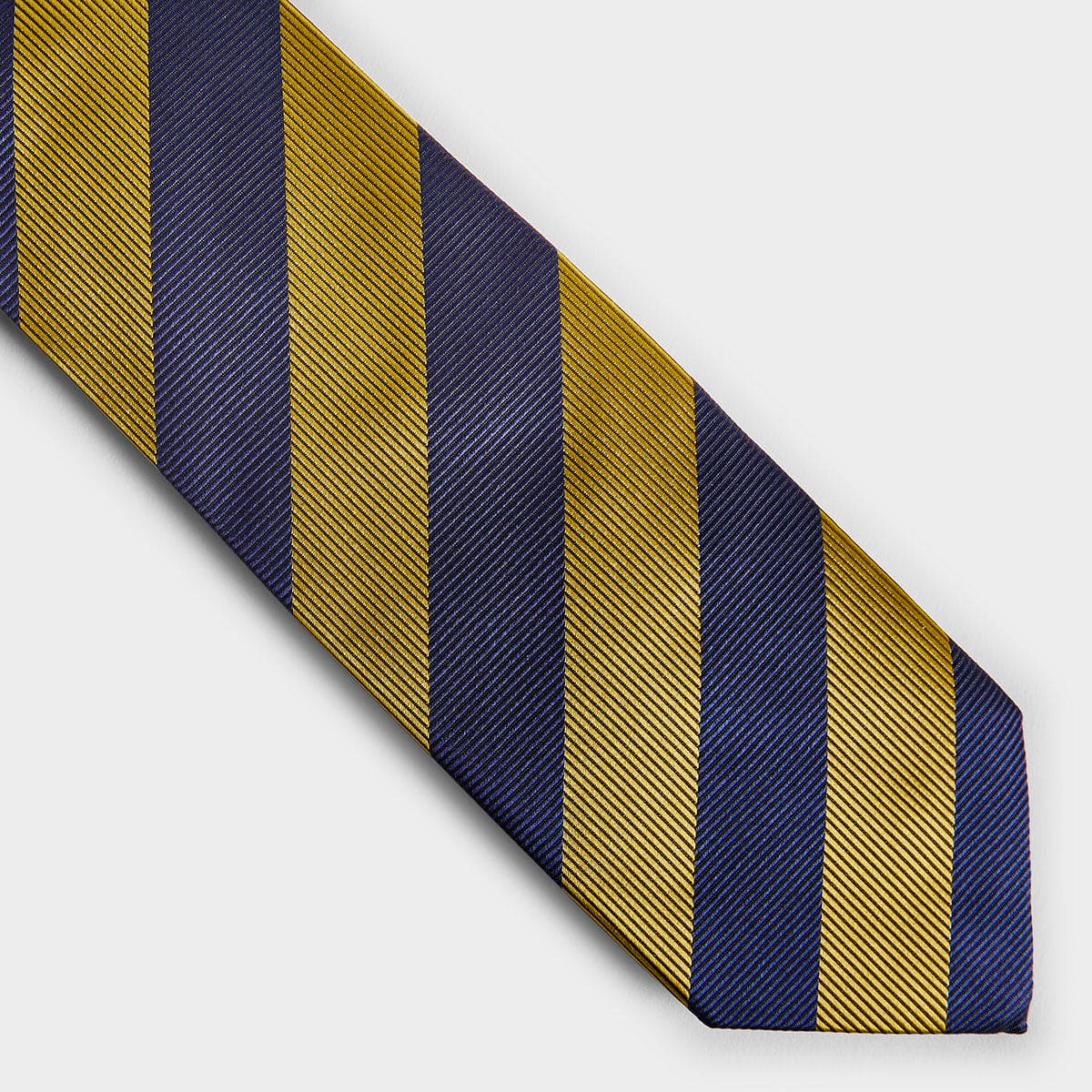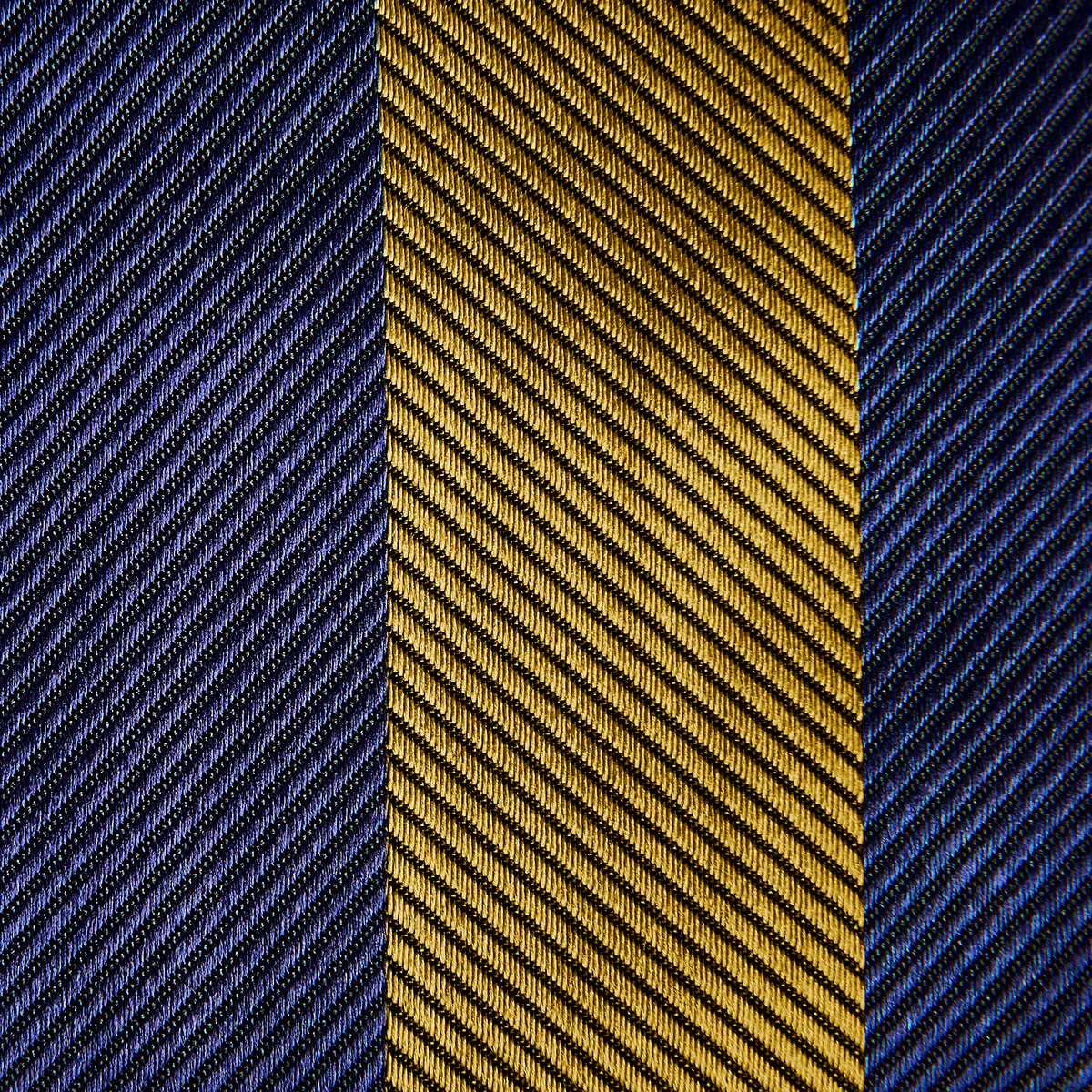 Indulge in luxury with our Gold & Navy Block Stripe Silk Tie. This handcrafted tie is made in England from opulent, woven silk and features a traditional, self-tipped design. Elevate your style with this classic and timeless accessory.
