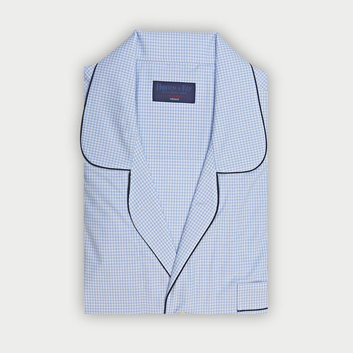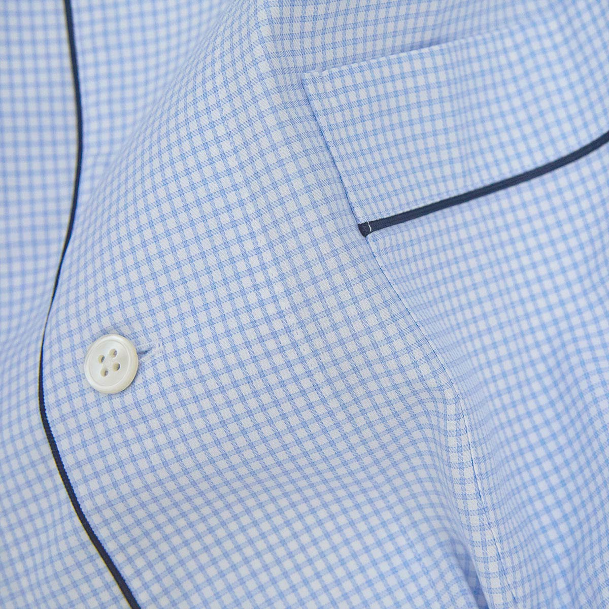 Slip into understated elegance with these light blue grid check cotton pyjamas, expertly tailored from premium cotton poplin. Adorned with navy silk piping and lustrous mother of pearl buttons, every detail whispers luxury. The relaxed drawstring waist and open fly design prioritise your comfort without sacrificing sophistication. Perfect for those who believe that quality sleep deserves equally refined sleepwear.