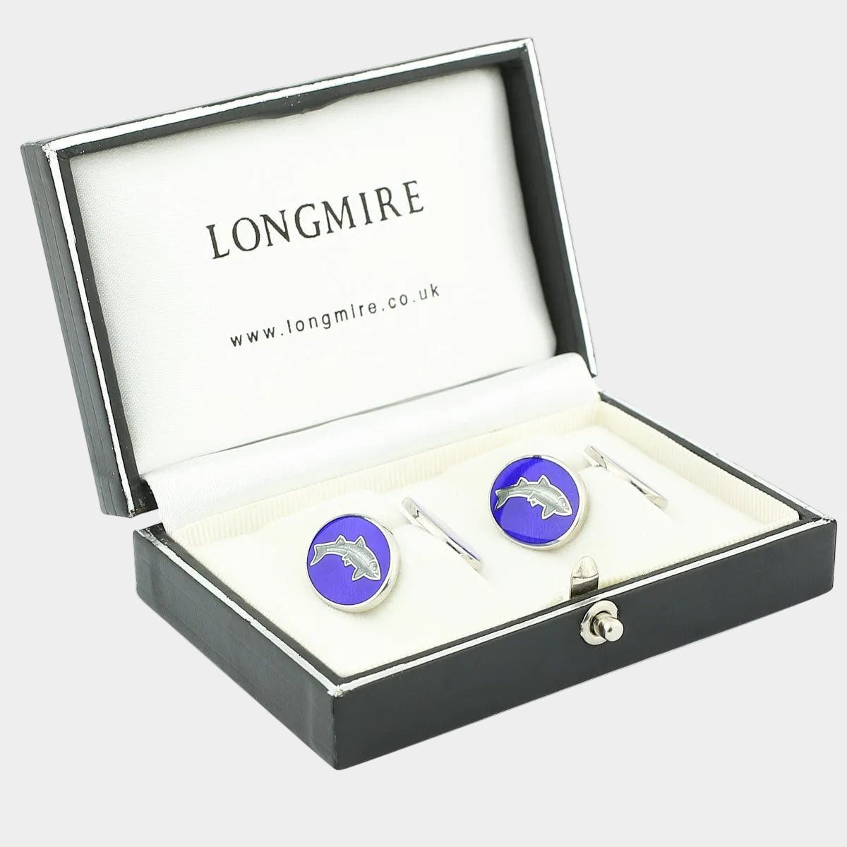 British jewellery house Longmire creates pieces designed to be noticed. Featuring leaping grey salmon against a swell of oceanic blue, the playful design is married with exceptional craft, featuring hand enamelling, rhodium plating and solid sterling silver. A prized sartorial catch.