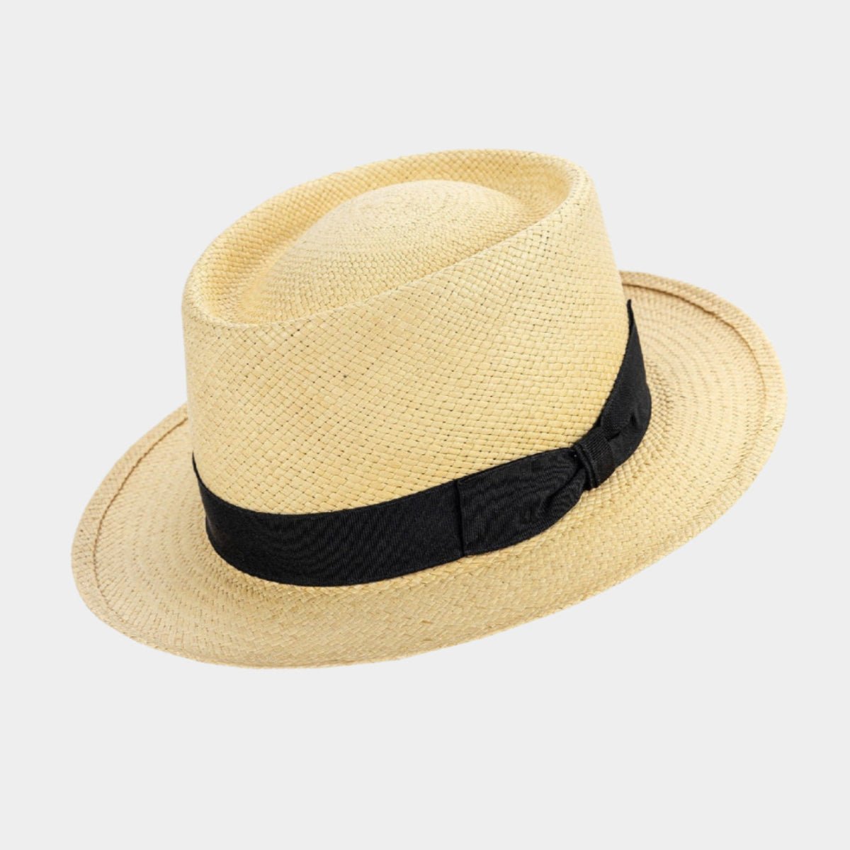 This Natural Pork Pie Panama, crafted in Ecuador, features exquisite Grade 16 Panama straw and is elegantly finished with a distinguished Black Ribbon, embodying timeless sophistication.